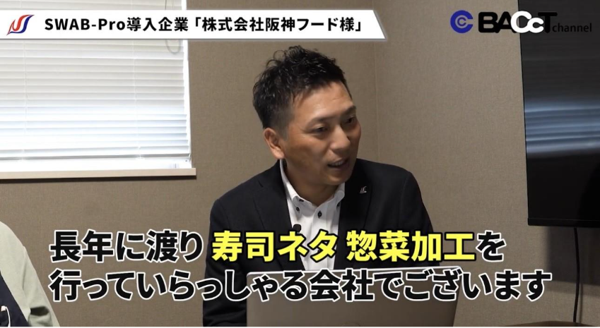 弊社の商品であるSWAB-Proは、多くのお客様にご利用いただいております。現地のインタビューも交えながら、みなさんにお届けしていきたいと思います。兵庫県川西市に本社を置く株式会社阪神フード様に来ております。昭和51年に会社を設立した寿司ネタ・惣菜加工を行っている会社です。