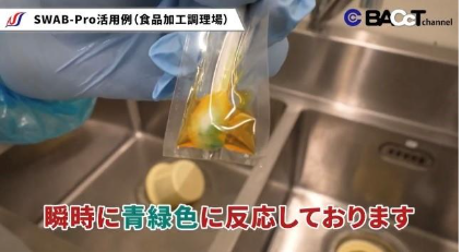 動画では、左側(下図左)の洗浄済みエリアに対して拭き取り検査を行い、反応が出なかったことで「適切に洗浄されていた」と判断。一方、右側(下図右)の未洗浄エリアでは青緑色の反応が出たため、再洗浄→再検査という流れで衛生状態を確認しています。