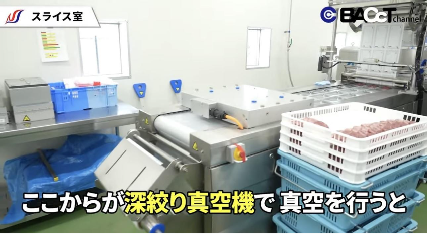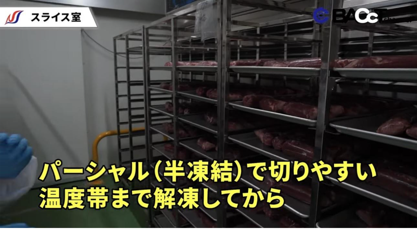 - 目入れ機による選別:スライス後は目入れ機を通して、赤身や霜降りが偏らないように部位を選別。見た目と食感のバランスを整える工夫がなされている。