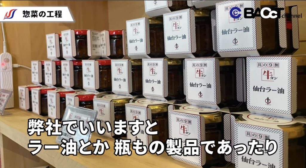 陣中では、牛タンを活用した惣菜製品の製造を行っています。代表的な商品には、具入りラー油やレトルト製品などがあり、いずれも自社工場で丁寧に加工されています。作業は3つの工程で行われます。