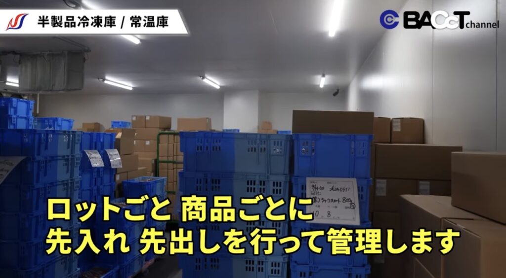 • 半製品冷凍庫では、ロットごと・商品ごとに先入れ先出し(FIFO)を徹底。製品化室と直結しているため、製品化のタイミングでスムーズに取り出すことが可能です。冷凍庫から製品化室への動線が短く、温度管理と作業効率の両立が図られています。