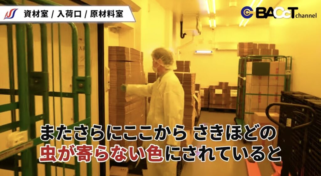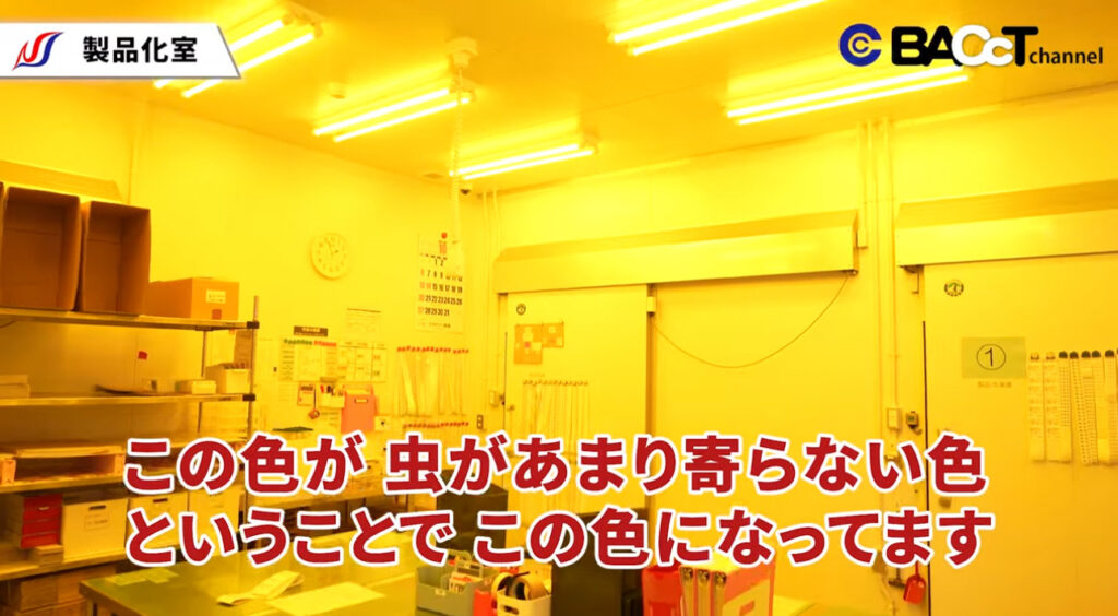 製品化室では、外部と繋がるシャッターを通じて商品の受け渡しが行われるため、虫の侵入リスクがあります。そこで、虫が寄りにくい波長の蛍光灯を使用し、衛生環境を維持しています。