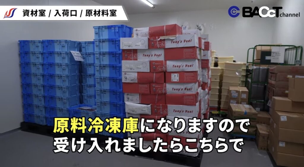 製品化前の半製品は、適切な温度帯での保管が求められます。このエリアには、冷凍庫と常温庫の2種類の保管庫が設けられており、それぞれの特性に応じた管理が行われています。