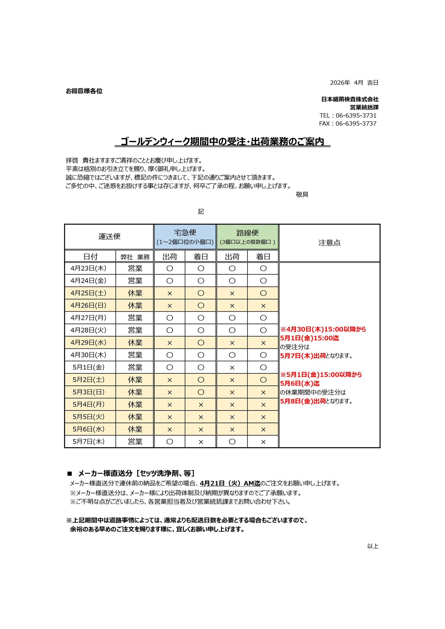 2026年ゴールデンウイーク期間中の受注・出荷業務案内
